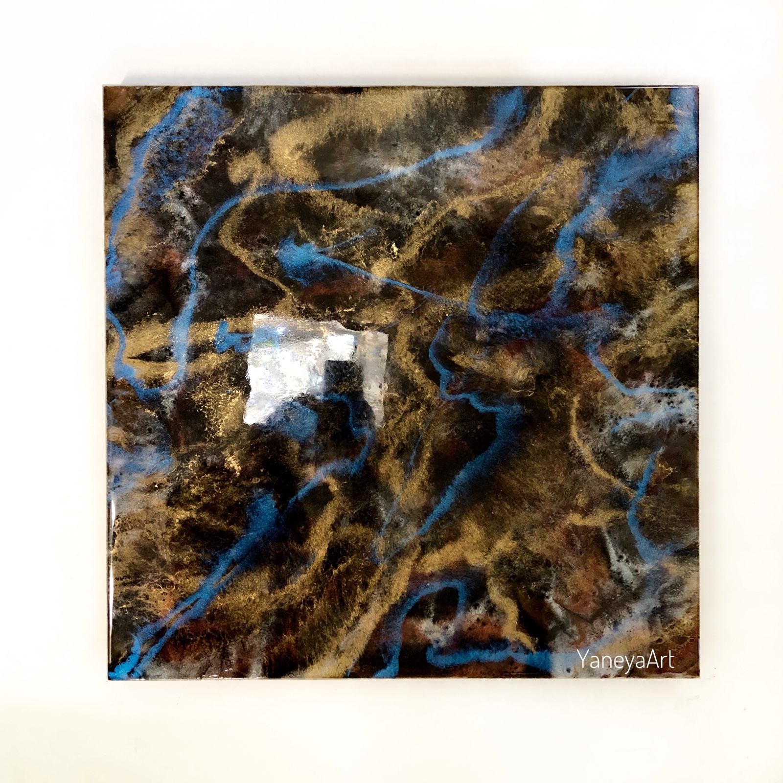 All below Art is hand painted with acrylics or resin. Many items are coated with resin. Several have some gold or silver leaf, glass and other material for the texture and visual effects.
