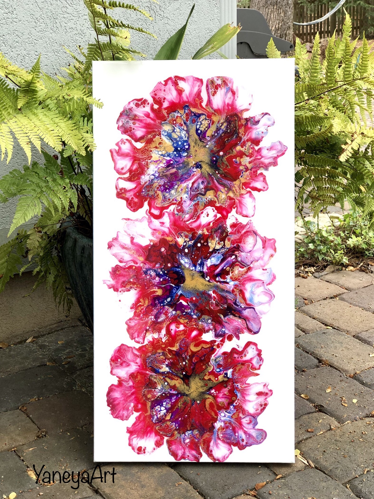 3 red flowers – 15×30” acrylic, glitter, resin (sold)