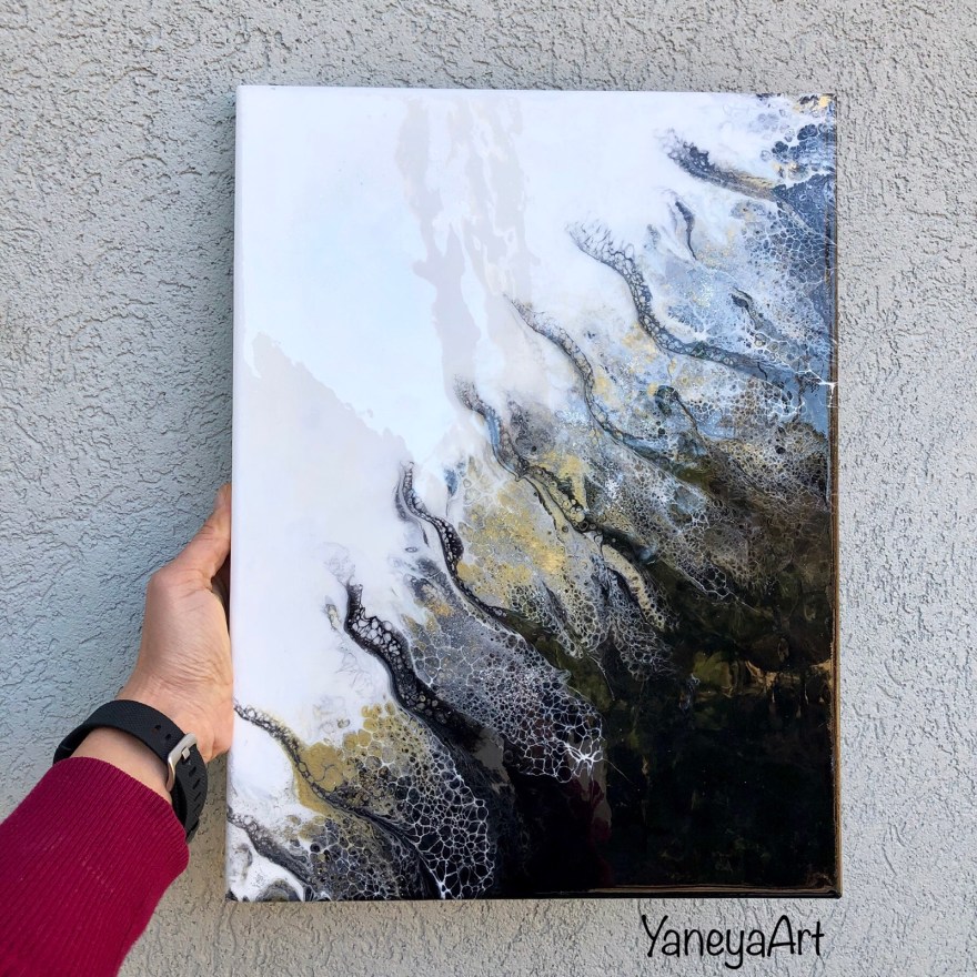 All below Art is hand painted with acrylics or resin. Many items are coated with resin. Several have some gold or silver leaf, glass and other material for the texture and visual effects.