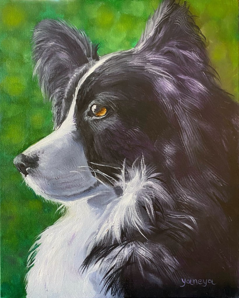 Black Collie on the green background. Oil on 14×11″ canvas board.